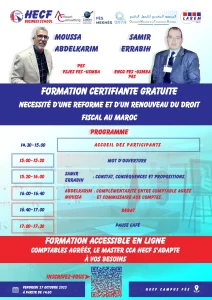 La conférence “Nécessité d’une réforme et d’un renouveau du droit fiscal au Maroc”, organisé par l’école HECF Business School pour le vendredi 27 octobre 2023 en collaboration avec l’OPCA de Fès, revêt une importance capitale dans le paysage fiscal et économique marocain Animé par Moussa Abdelkarim, professeur à la FSJES de Fès, et Samir Errabih, professeur à l’ENCG de Fès, cet événement se propose de rassembler des experts, des universitaires et des professionnels pour une discussion approfondie sur les défis et les opportunités liés au droit fiscal marocain. L’objectif de cette rencontre est de débattre des nécessités de modernisation et d’adaptation du droit fiscal dans le contexte des réalités économiques actuelles du Maroc. Ce sujet est d’une importance stratégique, car il touche à des aspects clés du développement économique, de l’équité sociale et de l’efficacité administrative dans le pays. La réforme fiscale est cruciale pour assurer une meilleure justice fiscale, stimuler l’investissement et soutenir la croissance économique durable.