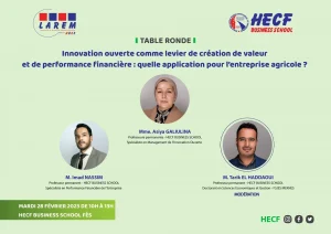 La table ronde “Innovation ouverte comme levier de création de valeur et de performance financière : quelle application pour l’entreprise agricole ?”, organisée par LAREM-HECF Business School sur le campus de Fès le mardi 28 février 2023, revêt une importance significative dans le contexte de l’agriculture moderne. Cet événement met l’accent sur l’innovation ouverte, un concept crucial dans un secteur en constante évolution comme l’agriculture. L’innovation ouverte encourage les entreprises agricoles à collaborer et à partager leurs connaissances et leurs ressources, favorisant ainsi une croissance et une performance financière accrues.